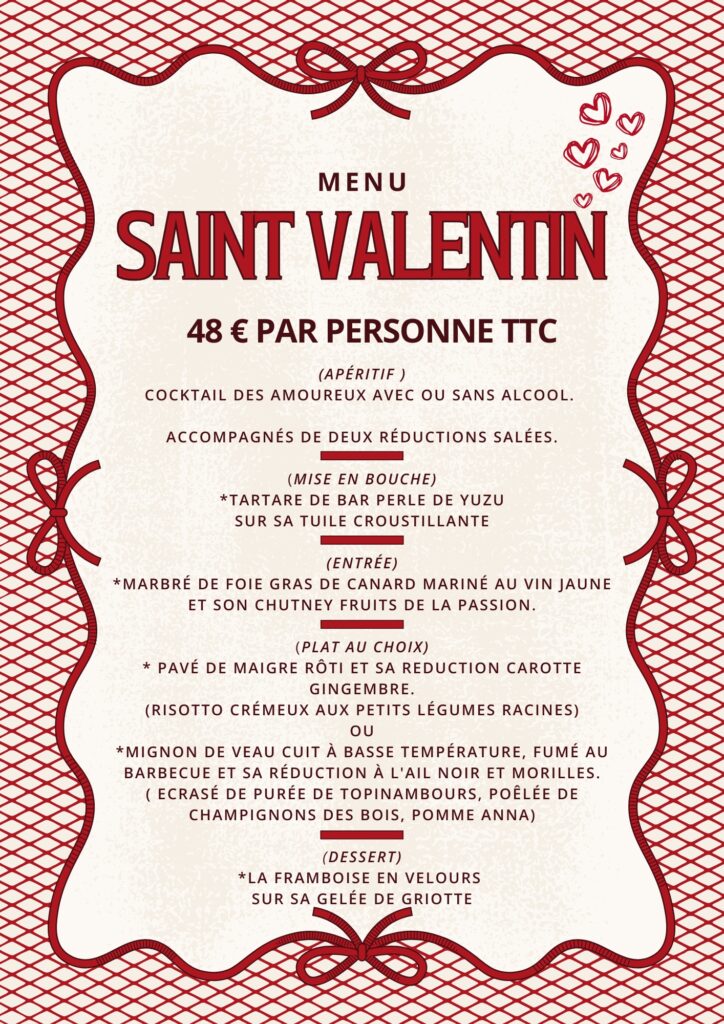 La fête des amoureux approche, et quoi de mieux que de partager un moment gourmand et raffiné avec votre moitié ? Pour cette occasion spéciale, 📍 Le Restaurant La Suite vous propose un menu unique, spécialement conçu pour éveiller vos papilles et célébrer l’amour dans une ambiance chaleureuse et romantique. 🕯️✨